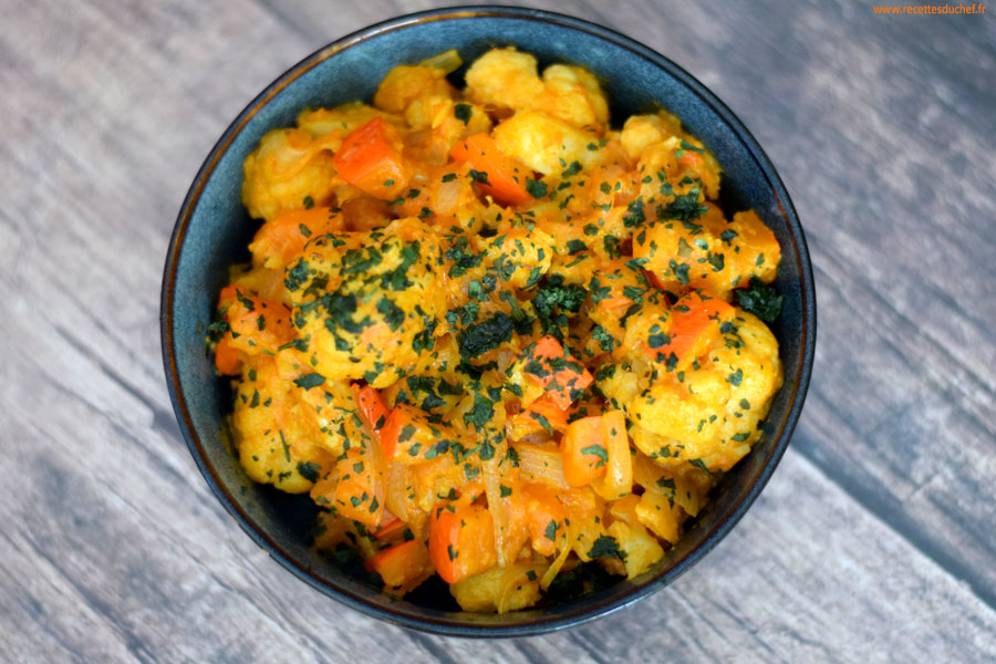 3. Ajoutons le curry, les légumes égouttés, le lait de coco, le concentré de tomate et un verre d’eau. Saler et poivrer à convenance et laisser cuire à feu doux pendant 15 min.